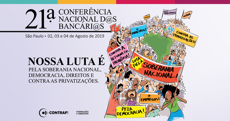 Bancários de todo o país se reúnem a partir desta sexta-feira, 2 até domingo, 4, em São Paulo, na 21ª Conferência Nacional da categoria. Os delegados e delegadas vão debater sobre questões que interferem diretamente na sociedade, no cotidiano de trabalho nas agências e nos departamentos bancários e definir as estratégias e plano de ações para defender a soberania nacional, a democracia, os empregos, os direitos dos trabalhadores e ações contra a reforma da Previdência e as privatizações dos bancos e demais empresas públicas. A categoria é a única que possui uma convenção coletiva que engloba todo o país. Os direitos dos bancários são os mesmos em qualquer ponto do território nacional.