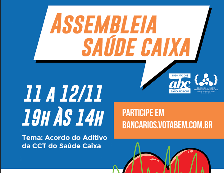 ASSEMBLEIA SAÚDE CAIXAO Sindicato realiza na próxima terça, 11 de novembro, plenária e assembleia com os empregados da Caixa que têm como tema central o Acordo do Aditivo da CCT do Saúde Caixa. A plenária, presencial, começa às 18h e será na sede social do Sindicato – Rua Xavier de Toledo, 268 – Centro – Santo André – SP.
