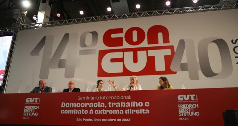 Durante o seminário nesta quinta-feira (19), que antecede a abertura oficial do 14º Congresso Nacional da CUT (CONCUT), o chefe da Assessoria Especial de Assuntos Internacionais do Ministério do Trabalho e Emprego do Brasil, Valter Sanches, adiantou que uma das propostas é aproveitar eventos internacionais, como o G20, as COP 28 e COP 30 para discutir com a Organização Internacional do Trabalho (OIT), uma agenda comum de proteção aos direitos trabalhistas.