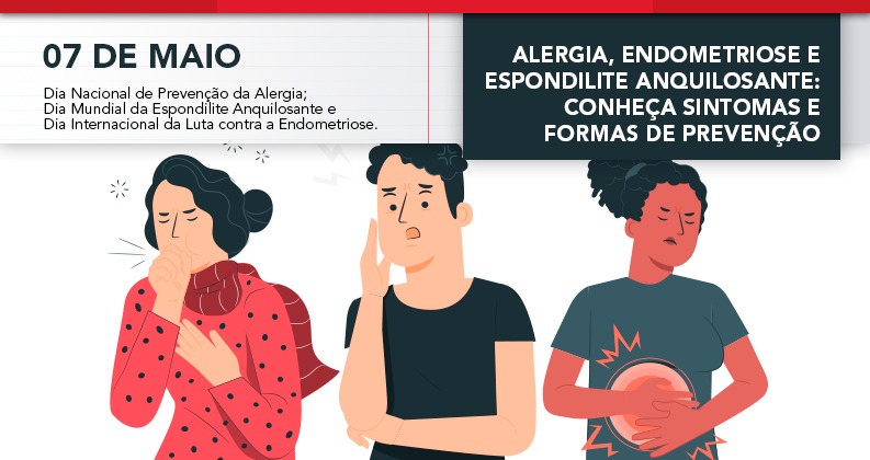 Três doenças são lembradas neste 7 de abril, para alerta e prevenção. As datas dizem respeito ao Dia Nacional de Prevenção da Alergia; Dia Mundial da Espondilite Anquilosante e o Dia Internacional da Luta contra a Endometriose. Saber mais sobre elas é fundamental para poder buscar auxílio médico e o correto diagnóstico e tratamento, destaca o secretário de Saúde do Sindicato, Itamar Batista. Confira: