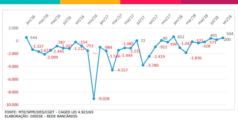 As instituições bancárias demitiram 24.025 trabalhadores nos nove primeiros meses de 2018, segundo análise elaborada pelo Departamento Intersindical de Estatística e Estudos Socioeconômicos (Dieese), com base nas informações do Cadastro Geral de Empregados e Desempregados (Caged). No mesmo período os bancos contrataram 22.284 pessoas, restando um saldo de 1.741 postos de emprego bancário a menos em todo o País.