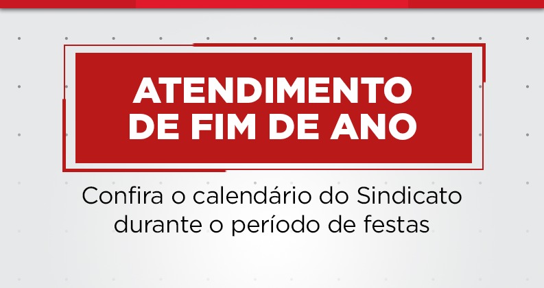 O Sindicato informa que, nas duas semanas festivas de final de ano (Natal e Ano Novo), permanecerá aberto de segunda a quinta-feira, fechando nas sextas.