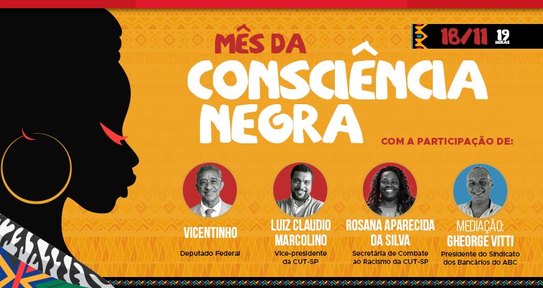 Uma live nesta quinta, 18, discute questões relacionadas ao mês da Consciência Negra e convida para ato que acontecerá em 20 de novembro. O encontro terá a participação do deputado federal Vicentinho (PT-SP), do vice-presidente da CUT-SP, Luiz Cláudio Marcolino, e da secretária de Combate ao Racismo da CUT-SP, Rosana Aparecida da Silva.