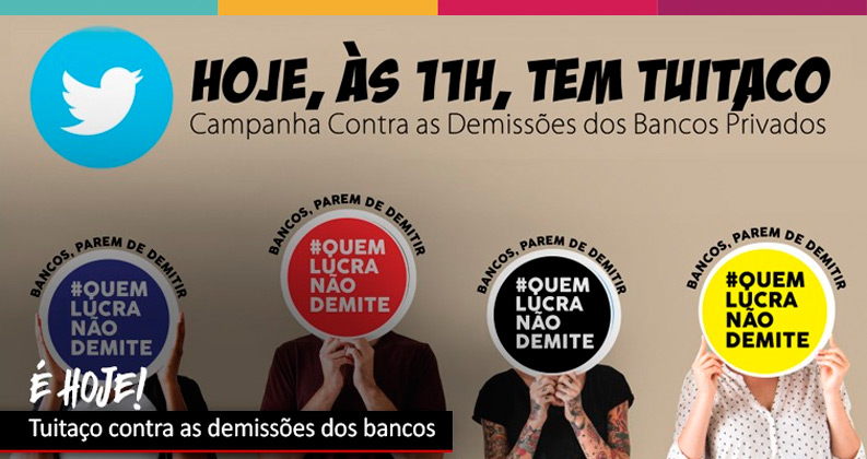 Hoje (sexta-feira, 30/10) tem tuitaço contra as demissões realizadas pelos bancos. O protesto faz parte da campanha organizada pela Confederação Nacional dos Trabalhadores do Ramo Financeiro (Contraf-CUT) e pelo movimento sindical bancário. O tuitaço será às 11h, com a hashtag #QuemLucraNãoDemite.