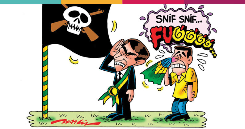 Pois bem. Hoje, com a eleição de Bolsonaro para presidente, o Brasil voltou a ter muitos militares em postos-chave no governo (inclusive dentro de bancos públicos), mas parece que nacionalismo anda em baixa. Exemplo disso é o vídeo em que o filho do presidente aparece limpando suas “lágrimas” na bandeira nacional, o que, para quem não sabe, fere a lei de 1971 que trata destas questões.