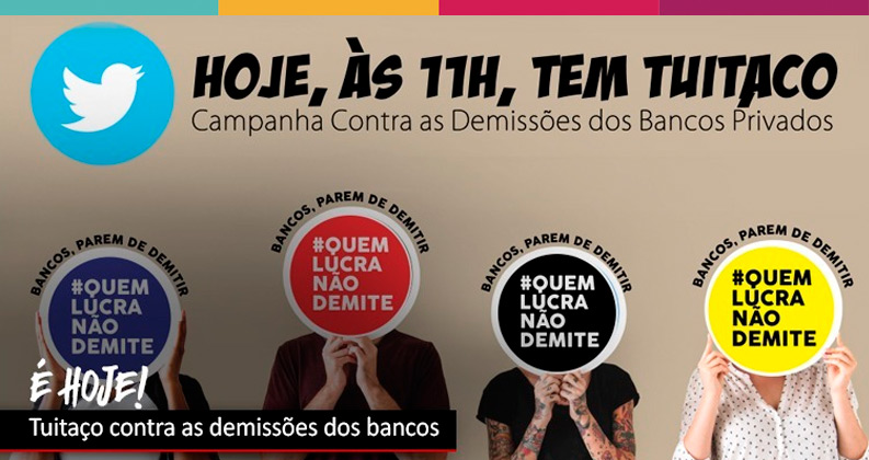 Hoje (sexta-feira, 4 de dezembro) vai ter um novo tuitaço contra as demissões realizadas pelos bancos. Será às 11h, com a hashtag #QuemLucraNãoDemite. A mobilização em defesa do emprego faz parte da campanha organizada pela Confederação Nacional dos Trabalhadores do Ramo Financeiro (Contraf-CUT) e pelos sindicados dos bancários.